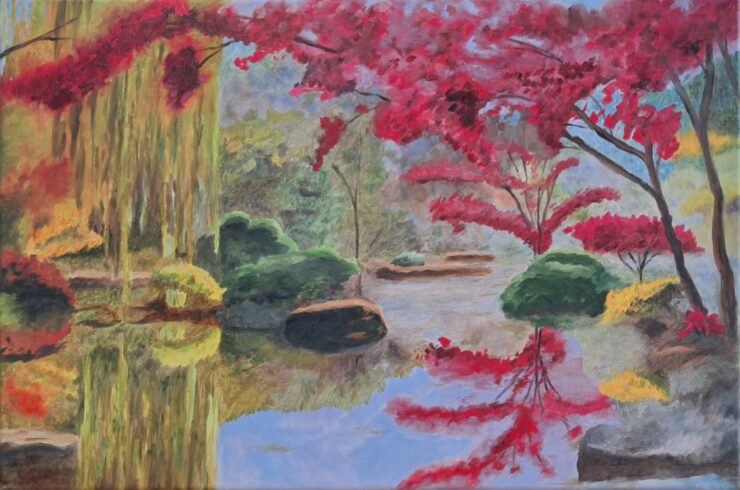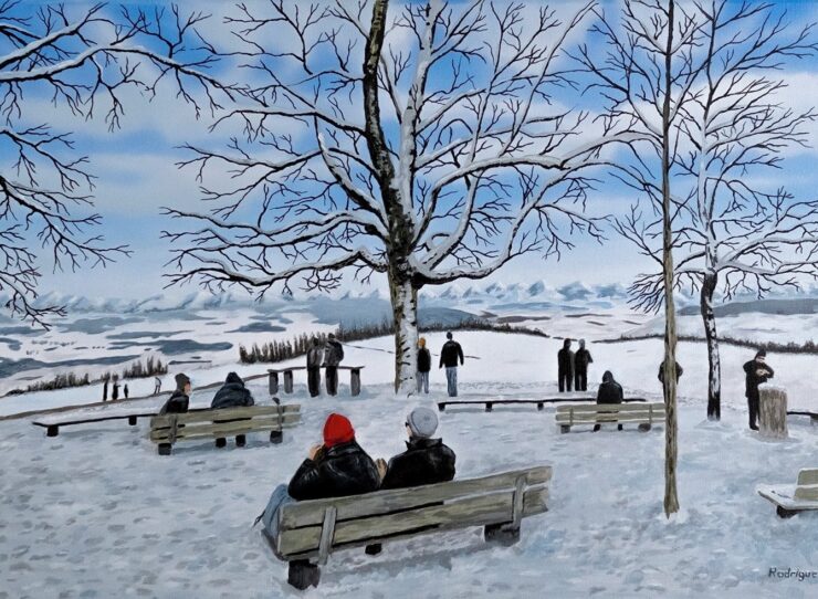 « L’ergothérapeute m’a laissé explorer sans contrainte. Pyrogravure, dessin, puis ces grandes toiles. L’acrylique d’abord, puis l’huile que j’ai immédiatement appréciée pour sa capacité à restituer des dégradés infinis. Étudier la couleur est devenue une réelle passion et ce regard sur le monde m’accompagne au quotidien. Et contrairement à mes créations numériques invisibles, mes tableaux existent aux yeux des autres, tissent des liens. »